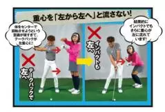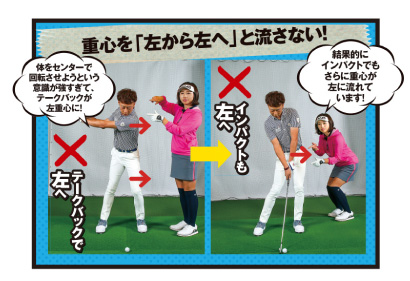 (写真 左) 体をセンターで回転させようという意識が強すぎて、テークバックが左重心に!