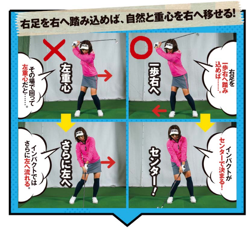 テークバックで左に残っていた重心を、大胆に右へと移すイメージで!