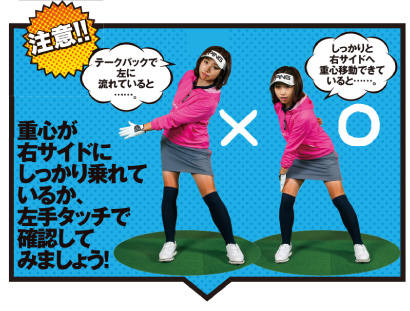 重心が右サイドにしっかり乗れているか、左手タッチで確認してみましょう!