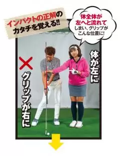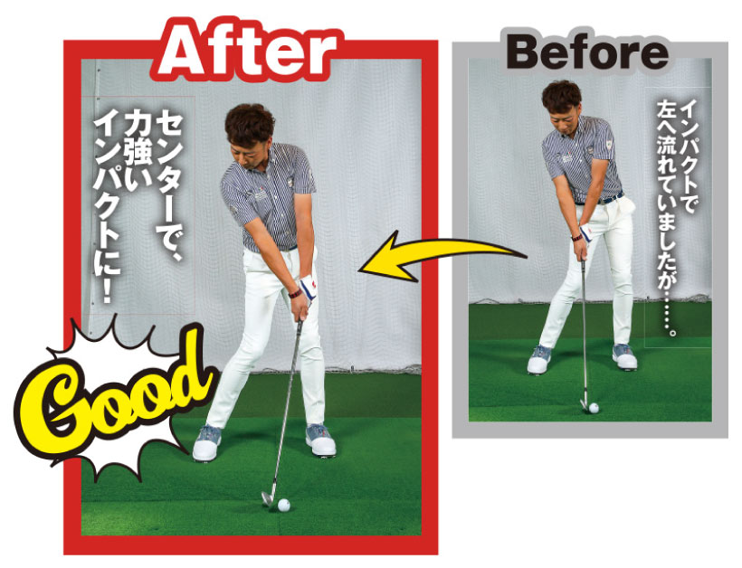 (写真 右) 結果的にインパクトでもさらに重心が左に流れています!