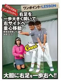アドレスからテークバックへ、右足を一歩大きく開いて、右サイドへ重心移動する感覚を体感してみましょう!