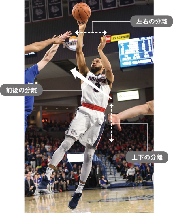 前方向に向かうシュートする動きに対して、ディフェンスを避けるために後ろにジャンプする動きがカウンターとなり、力が拮抗することでバランスの取れたシュート姿勢になる。