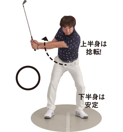 バランスを取るためには、上半身と下半身を分離して動かしたい。ゴルフでは下半身の土台の上で、上半身を回転させる動きがそれだ。