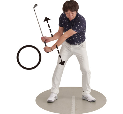 左手は下方向、右手は上方向に動き、テコを使ってクラブを操れる状態。ダウンスイング以降では逆に、左手は上方向、右手が下方向に動くことでヘッドが走る。