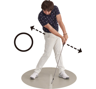 ダウンスイングでは前方向に力が加わる。クラブの大きなエネルギーに対抗するため、カラダは後ろ方向のカウンターの力を入れて、拮抗させる。