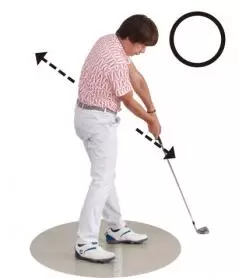 前に向かおうとするクラブの遠心力に対して、カラダはボールから遠ざかるような力でカウンターを入れることで、バランスが保たれる。