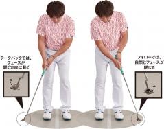 ゴルフクラブという物体は、テークバックでフェースが開き、フォローで閉じる特性をもっている。ゴルフスイングを正面から見ると、「クラブが上がって、下がって、上がる……」のように2次元的に捉えがちだが、実際は上下・左右・前後に3次元的に動いていると認識すべき。