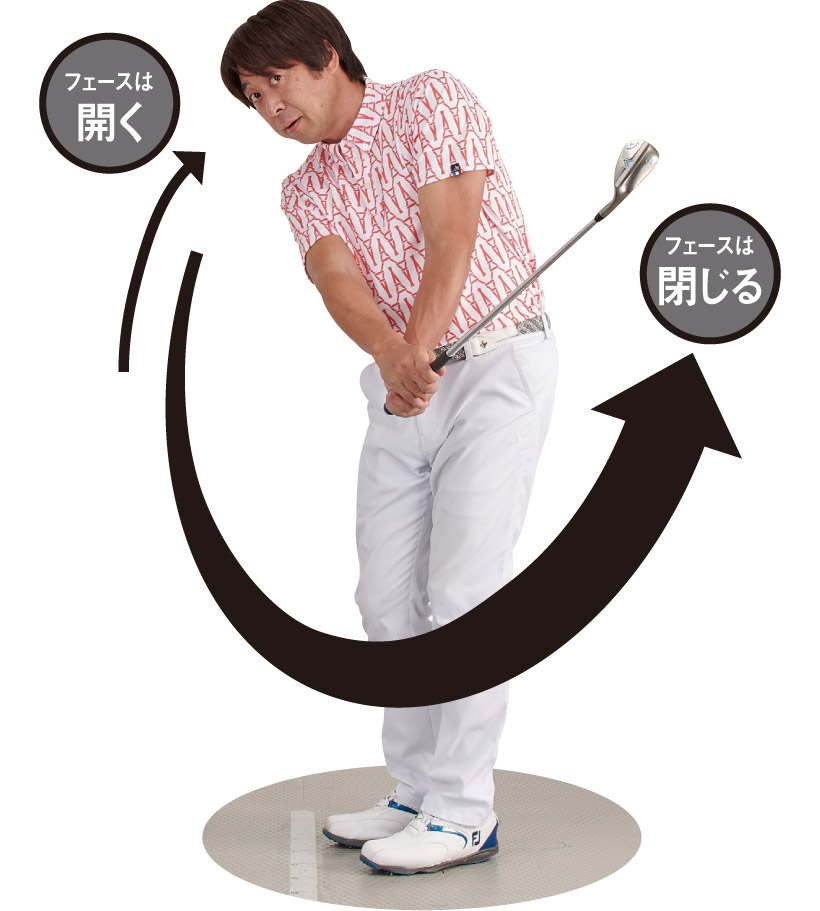 バックスイングでは、ヘッドがカラダの右上に向かいながら、フェースが開くように動く。