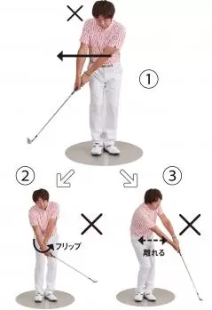 ③ヘッドを真っすぐに動かそうとすると、腕がカラダから離れてしまい、シャンクやダフリなどの原因になるほか、再現性も低くなる。