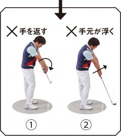 ②フェースを戻すために、インパクトで手元が浮いてしまう。自然なフェースローテーションが行われないためにスライスしやすい上、トップなどのミスも出る。