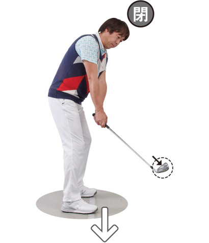 ②トップでフェースが閉じると、ダウンスイングではフェースが開くように動く。アマチュアに多い、スライスの大きな原因になる。