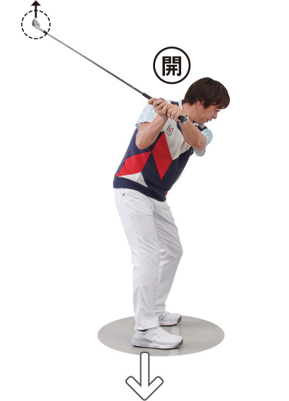 切り返し以降、フェースは開いていく。フェースが上を向くこの状態は、一般的なゴルフ理論ではシャット(=閉じている)とされるが、グラビティメソッドでは、ボールに対して「開」の状態ととらえる。