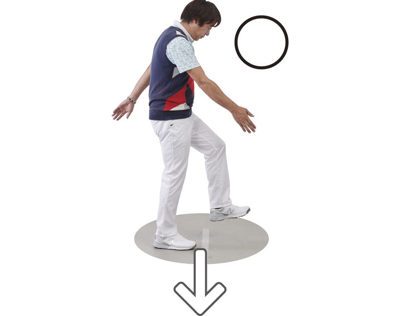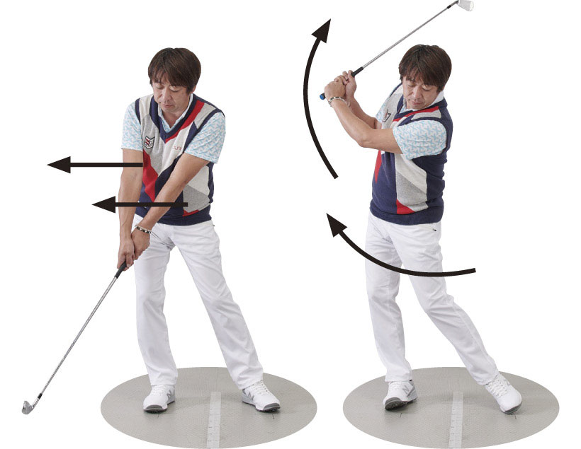 これができると、左右の腕が分離して逆方向に動き、縦回転する上半身に対して、下半身が横回転しやすくなります。これが上半身と下半身の分離動作です。また、腕をネジるなどの力を加えないので、フェースが自然と「閉→開→閉」の動きになりやすくなるのです。