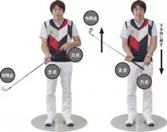 それらを上手く使うコツが、「テコ」を利用することです。具体的には、右手を「支点」、左手を「力点」、クラブヘッドを「作用点」と考えて、スイングの初動を「テコ」で開始するのです。左手で力を下に加えると、右手が支点となり、小さな力でクラブヘッドが高い位置まで動くのがわかります。