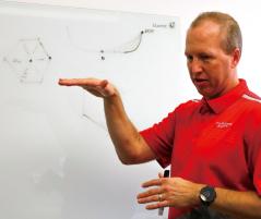 クロムソフトXの新しいエアロネットワークについて説明するデイブ氏。「空力に関しては新しい設計手法のほか、CFD(数値流体力学=Computational Fluid Dynamics)もよく使われます。AIは構造に対して、何度か研究を試みましたが、開発に生かされるのはまだ先の話ですね」
