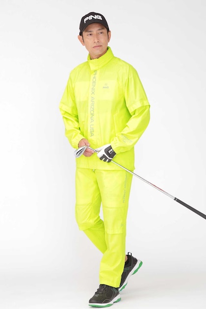 米アリゾナ生まれのゴルフギアPINGが提案するゴルフレインウェア上下セット。ブランドのアイデンティティを強調するロゴマーク「PHOENIX ARIZONA USA」をトップスのフロントに縦長に展開しているのが印象的です。