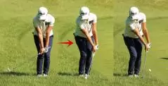 「アプローチでは手を使わないで、腹筋を使ってお腹を回すことが最も安定した軌道になります。特に右手1本だとお腹を回さないと上手く打てません。手打ちでハンドファーストを作ると入射角が急角度になる。緩やかな入射角にするためには、お腹を回して打つことが大切です」