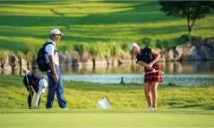 青木コーチはアプローチについて「最初は10ヤードの練習から、手を使わないで腹筋を回して打つことを意識しましょう。それには右手の片手打ちがいいです。左手はすくい打ちのクセがある人には特に効果的です」と語る。