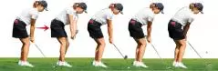 お腹を意識して打つ渋野日向子のアプローチは手が一直線に伸びたままお腹を回すので上半身に一体感がある。まずは、この形を目指すことがアプローチ上達の近道だ。