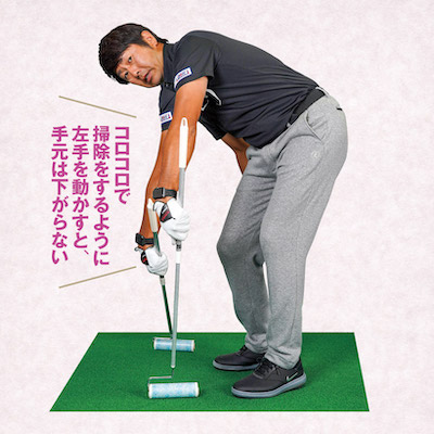 まず、左手だけで重いものを振ってみましょう。重いものを支えようと自然と手元は高い位置をキープします。手元を高くすることによって、フェースがどう動くかを確認するのには、長めのコロコロや平べったいホウキなどを左手だけで動かしてみるのが良いでしょう。
