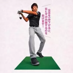 ダウンで右ヒザを外旋すると、左の股関節を右股関節から剥がすような動きができます。この動きによって、体の軸をブラさずにダウンスイングすることができます。