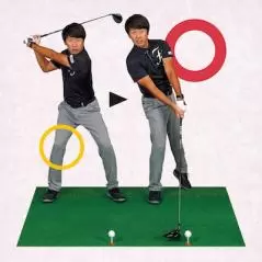 フォローでフェースが返るのは、体の軸が左に流れるから。その原因が、トップからの右ヒザの動き。右ヒザが内旋してしまうことで体が左に流れてしまう。