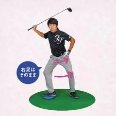 まずは左足を一歩後ろに下げてスイングすることで、トップから体が突っ込むのを防ぎます。そして、体が左に流れないように右ヒザを外旋させる動きができるようになることで、左股関節が右股関節から剥がれていくような動きを体感することができます。左股関節と右股関節に違う動きを持たせることでトルクを最大限に活かせるのです。