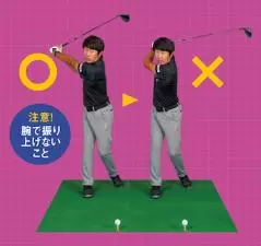 左足を下げている分上げられるところまででOK。これを無理に手で回すと窮屈なスイングになってしまうので、ドリルの意味がありません。