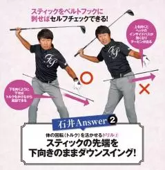 そこでスティックに下を向かせたままダウンスイングすることで、ヘッドがインサイドから来すぎるのを防ぎ、さらにインパクトで体が浮かなくなるので、トルクが生むパワーを逃さずに球に伝えることができるようになります。