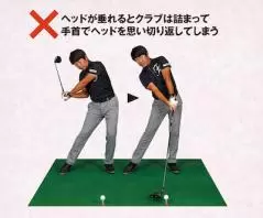 ×ヘッドが垂れるとクラブは詰まって手首でヘッドを思い切り返してしまう