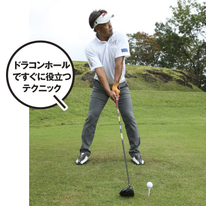 曲がってもいいからここ一番で飛ばしたいときにはボールを左に置いてティアップを高くします。加速する距離が長くなってヘッドスピードが上がります。コツは体を止めず、ボールが左にあっても素直に左方向に振ること。
