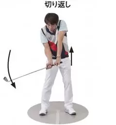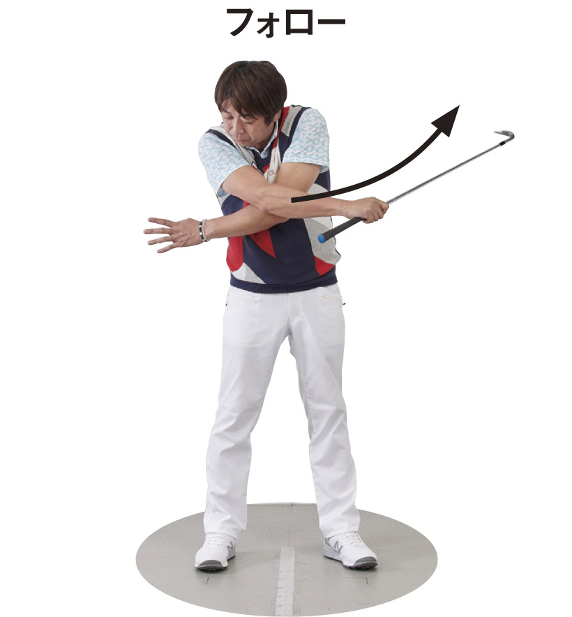 左手が直線的に上に動くと、右手を「支点」にクラブヘッドは斜め上に曲線的に動き、フェースが返る動きになるのです。このヘッドが左に向かって動きながら、ボールが真っすぐ飛ぶ感覚を身につけたいところです。