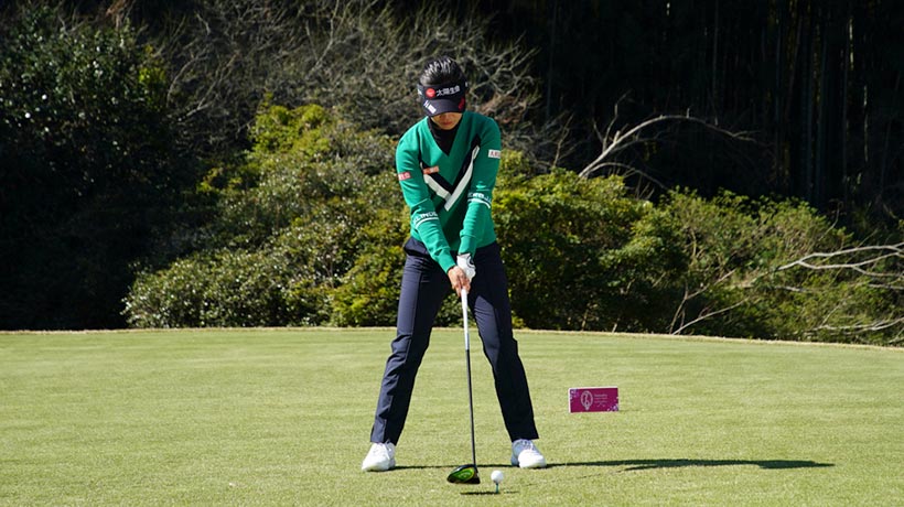 「ボール位置が左足カカトよりも内側なのは、テレサ・ルー選手が自分自身のスイングの最下点に合わせているからです」