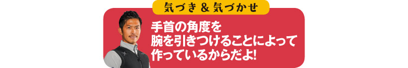 切り返しのタイミングで、グリップエンドを外に押せたら、ダウンスイングでも手首の角度をキープできる。