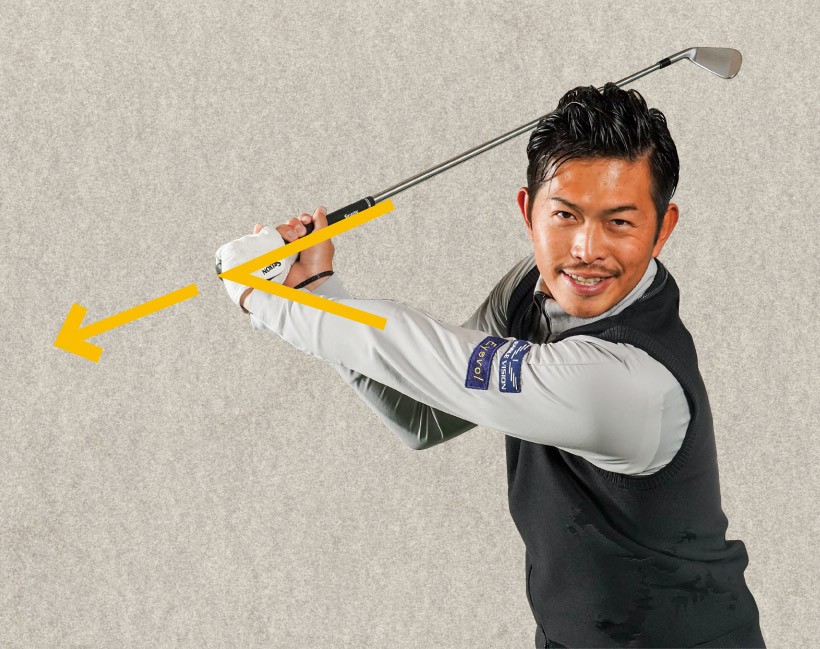 そこで、クラブの遠心力を使ってスイングできる自然なコックを作るために、切り返しからグリップエンドを外に押す意識を持たせました。グリップエンドを押すことで、切り返し時に手首は曲がった状態となります。すなわちコックが完成します。そこから体と一緒にダウンスイングするだけで、遠心力によってタメが解放され、スムーズにクラブがリリースされてインパクトできるので、入射角は安定し、フォローをキレイに振り抜くことができます。