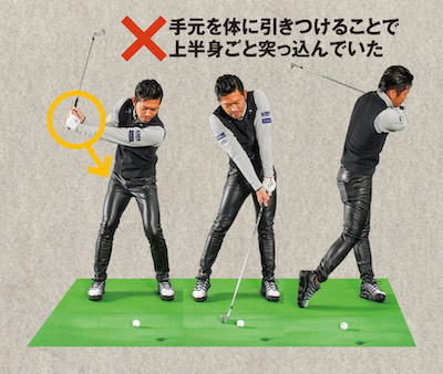 ダウンスイングで手元を体に引きつけて手首のタメを作ろうとしていたため、上半身が突っ込む形になってしまっていた。そのせいでインパクトで詰まって、入射角も悪くなり、フォローの抜けも悪かった。