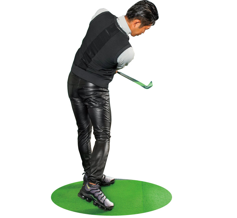 まずは自分の右足の隣にキャディバッグを置いてみよう。トップの形からグリップエンドを後方へ押したら、前傾姿勢を崩さずにそのままクラブを収納するように下ろす。