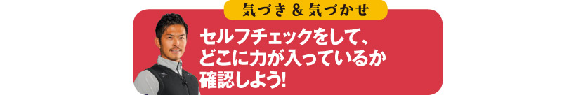 大半のアマチュアは、左右どちらかの手に力が入ってしまっています。グリップを強く握ってしまっていたり、極端にワキが開きすぎていないかチェックしましょう。