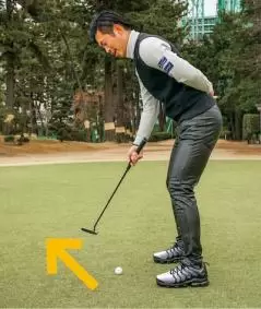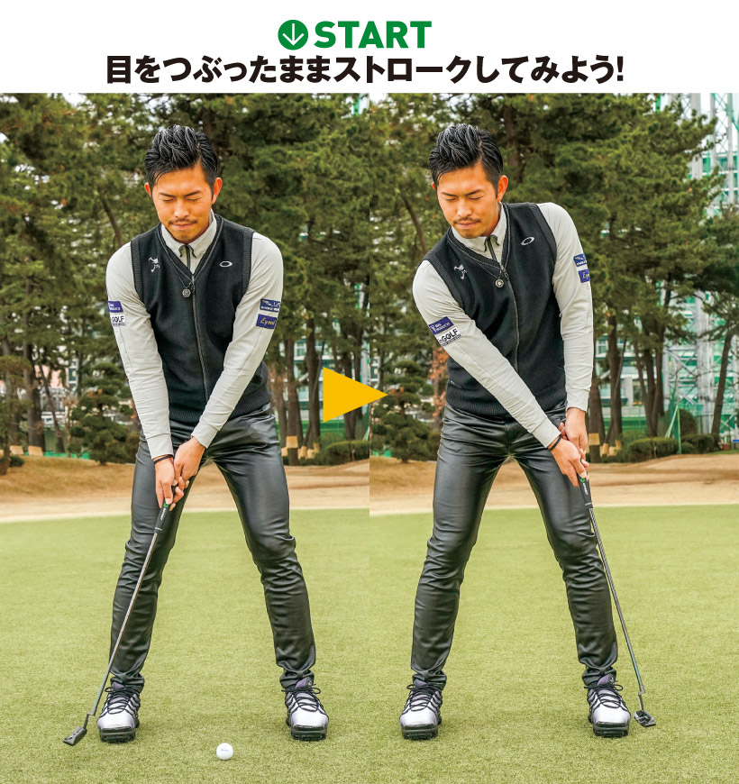 パターが入らない時、まずは自分のイメージしているストロークと実際のストロークがどこまで同じかを確認することが大事です。そこで両目をつぶってストロークします。ここでわかるのはインに上げていた「つもり」だったのに実際はアウトに上がっていたり、両足に均等に重心を置いていた「つもり」だったのに実際は右足に偏っていたり。と、自らの視覚を奪うことでイメージと現実の違いがわかるということ。