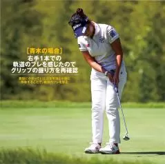 右手の親指にプレッシャーがかかっていたので、バックスイング時にヘッド軌道がアウトサイドにズレていました。そのプレッシャーを薬指、小指に変えて何度もストロークして修正し、初めて自分の中のイメージと実際の軌道が合いました。(青木)