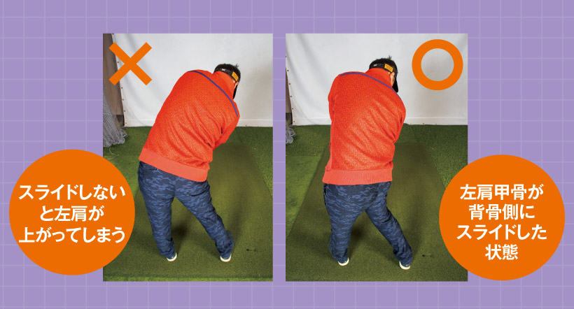 インパクト~フォローで左肩甲骨を背骨側に寄せる