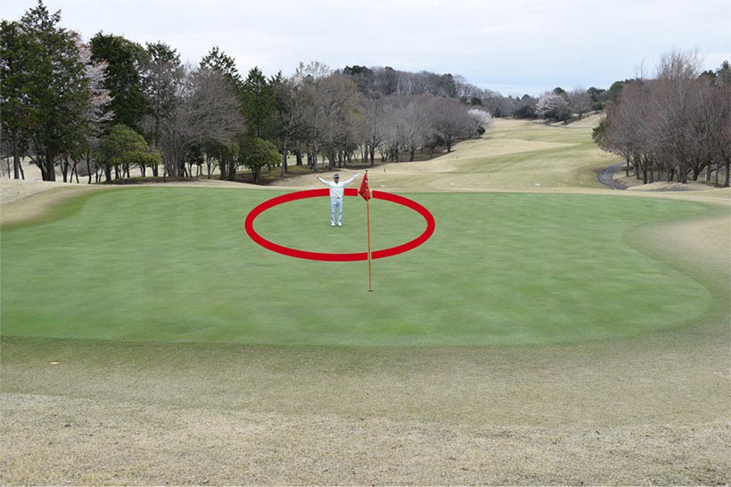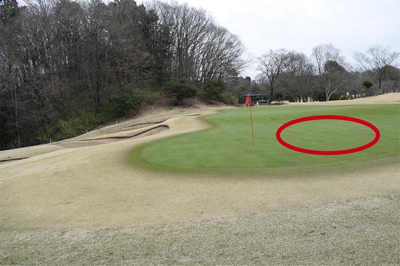 ピンが奥の場合はグリーンの真ん中に乗せるのがベストです。ピンが手前なら奥、ピンが奥なら手前。要はグリーンの真ん中に乗せておくのがもっとも確実な作戦なのです。