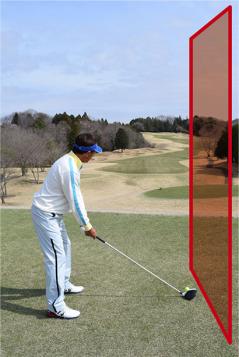 自分が打ちたい方向までのラインに沿って大きな壁が立っていると想定してみてください。自分は壁の前に立って構えていると考えて、あとは壁のラインに沿ってスイングするだけでOK。邪念がなくなり、ショットの点数が上がります。練習場でも打席間の仕切り板を大きな壁とイメージして打つ練習をすると効果的です。