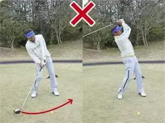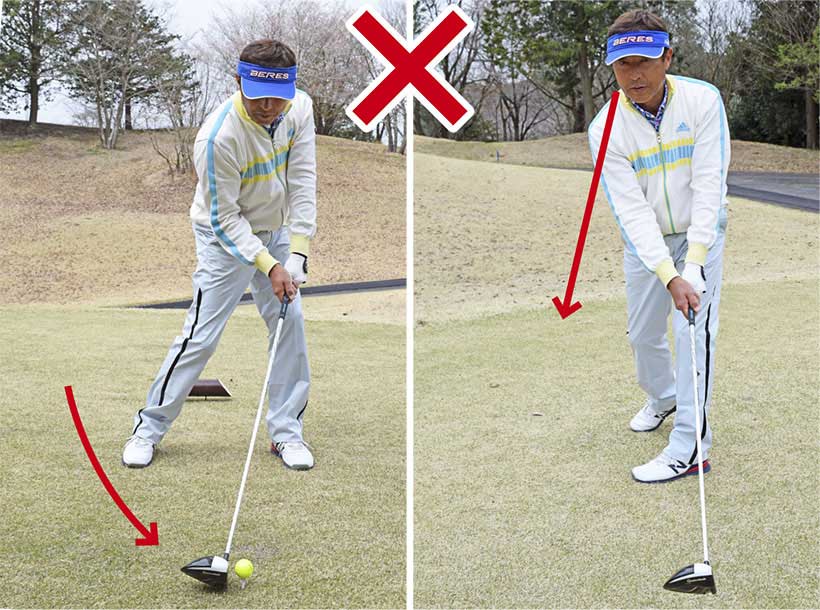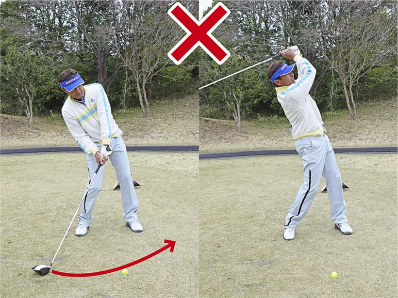 上体が右に傾いたままでスイングした結果、すくい打ちとなってチョロやダフリが出てしまいます。ダウンスイングでクラブが寝て下りてフェースが開きやすいですから、プッシュスライスも多発します。