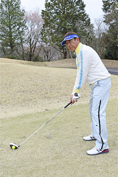 またティーイングエリアとフェアウェイの高低差が大きいほどアドレスの姿勢が変わりやすい点にも注意が必要です。下のほうに見えるフェアウェイに目線を注ぐと自分の気づかないうちに上体が左に傾き、左足体重の構えになりやすいのです。そのままスイングするとクラブヘッドが上から鋭角に入りやすくテンプラが生じやすくなります。フェースがかぶって当たり、左に引っかけてしまうケースもよくあります。