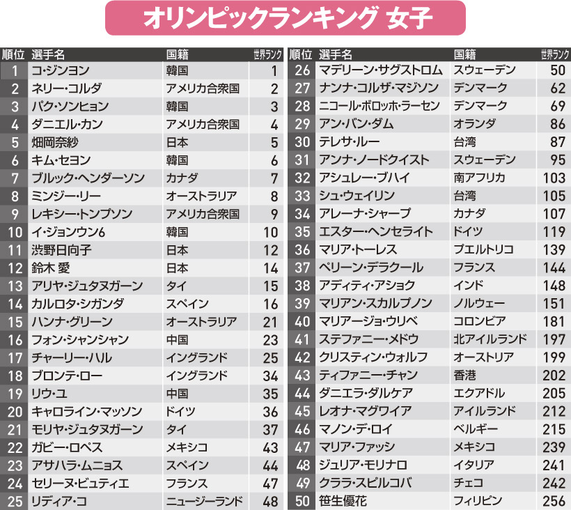 本来なら代表選考の締め切り前までに世界各地でトーナメントが開催され、その結果に伴って出場選手が決定するのだが、すでにご承知の通り、新型コロナウイルス禍によって2月から各地でトーナメントが中止や延期に追い込まれた。そのため、男子は3月15日付、女子は同16日付で世界ランキング中止の措置がとられ、これに連動してオリンピックランキングも停止した。