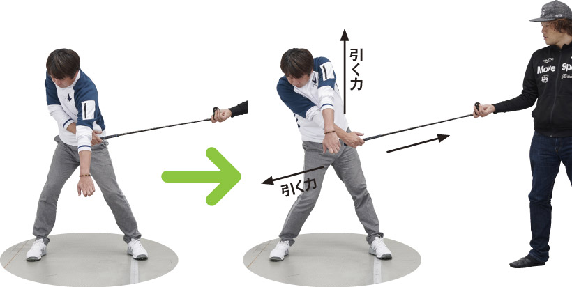 右手でクラブを「引く」力と、クラブヘッドを引く力(※スイングの場合はクラブの遠心力)が拮抗する感じを体感する。左手は上に引くように動き、右手と力のベクトルが違うことにも注目。