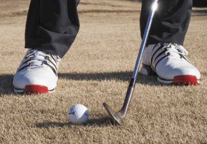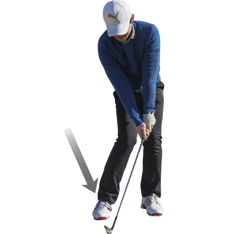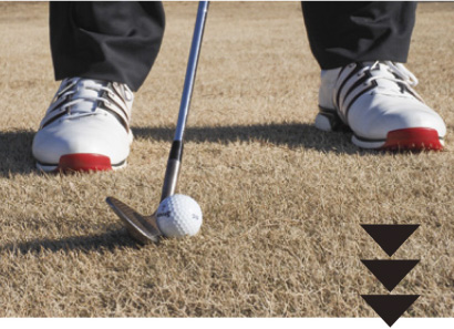 手前から低い球で狙うときは、ボールを右足の前に置いてヘッドを上から入れる。地面の抵抗でフォローは低くなる。