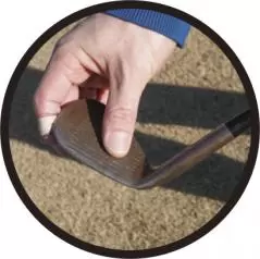 右手に力が入ると引っかけやすいのでフェースを返しすぎないよう飛球線方向へヘッドを出します。チェックするのはきちんとスピンの効いた球がピン方向に飛ぶかどうか。芝から打てるときはボールの先ギリギリからターフが取れていればOKです。