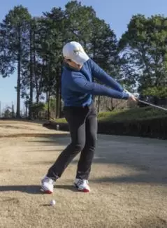 ドリルといってもやることはとても単純です。右足寄りに置いたボールを上から潰すようにして低い球を打つだけです。普段の練習場では100ヤードのピンを狙うので振り幅はスリークォーターくらいの大きさですが、体重移動はきちんと行い、ボールの真下を狙ってコンタクトさせることに集中します。